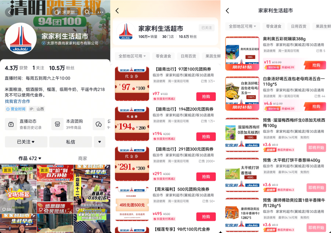 比如家家利超市,在经过多次测算后,确定了以百元代金券为主,经典产品、品牌新品为辅的销售模式。从抖音后台相关数据看,发现抖音代金券吸引来平均客单比传统渠道高出1倍多,表明平台引入的客流含金量更高。