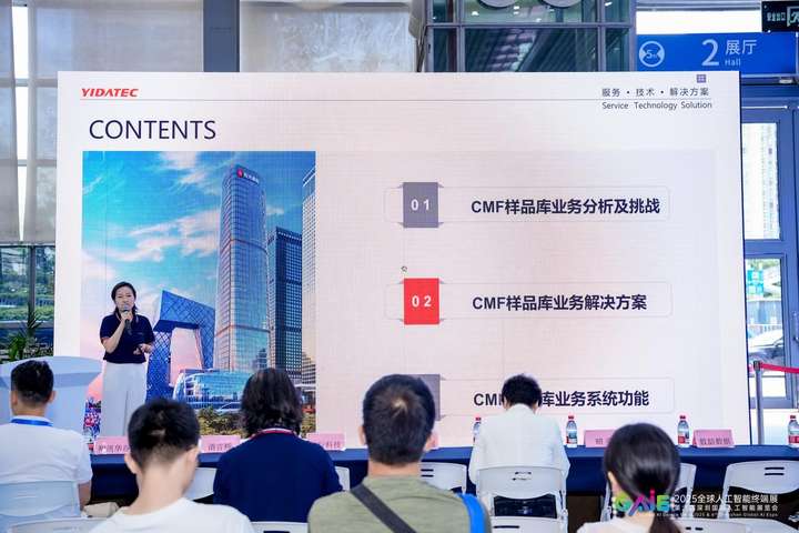 本届展会汇聚数百位来自全球的科学家、企业家与行业领袖,围绕端侧模型、具身智能、机器人、AI+创新应用、智慧教育等热点话题开展超30场高端论坛,打造国际化的前沿思想碰撞与深度交流。亿达科创高级产品经理常佩现场分享亿达科创在智慧管理领域的最新自研成果“CMF样品库信息管理系统解决方案”。
