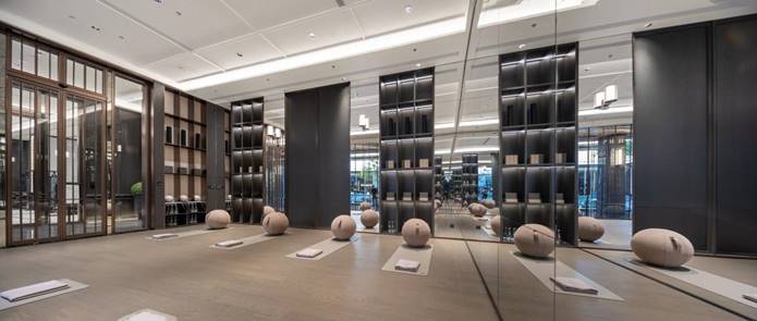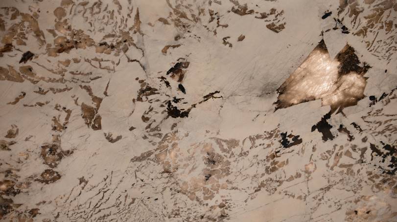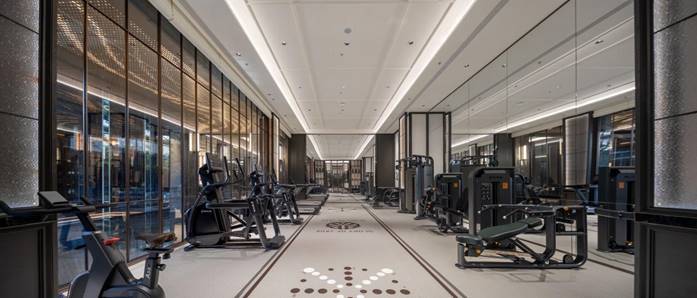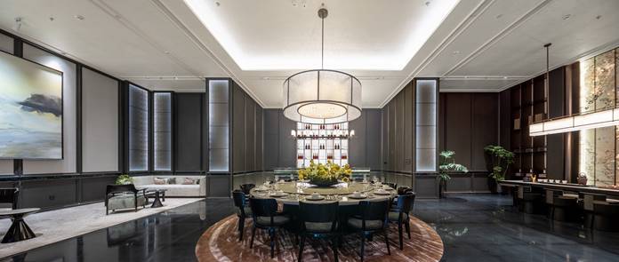 从现场外部看,大门奢华气派,约73米的艺术门廊,约9米挑高尺度,璀璨星空顶借意“俊采星驰”,幻影蓝花岗岩、普拉达绿奢石与爱马仕灰大理石等多种奢石匠造,这不仅是建筑大门,更是一座艺术装置。