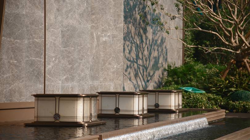 看细节,大地沉淀历久弥新的「永恒感」。摒弃常规的涂料与瓷砖,不惜成本采用多种臻稀石材,打造从建筑外立面到景观园林的完整石材体系。从会所大堂的水刀拼花,到园林节点的奢石铺装,每一处细节都经过多道工艺打磨,最终呈现堪比艺术馆的质感体验。