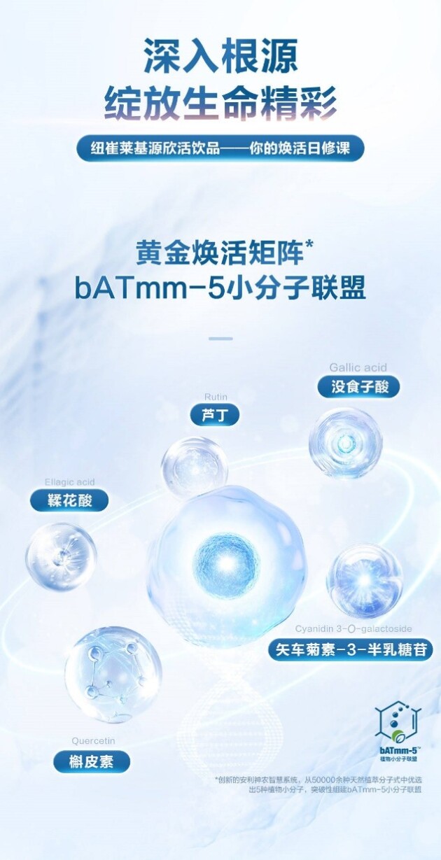 纽崔莱基源欣活饮品通过其独有的bATmm - 5™小分子联盟,针对细胞衰老的多个层面进行系统性、多靶点的干预。其核心抗衰机制主要体现在以下层面:
