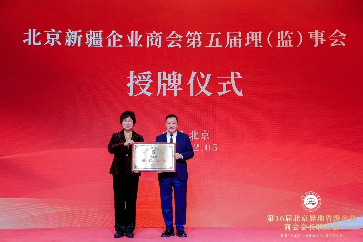 北京市政协副主席、市工商业联合会主席燕瑛为北京新疆企业商会会长丁国进授牌