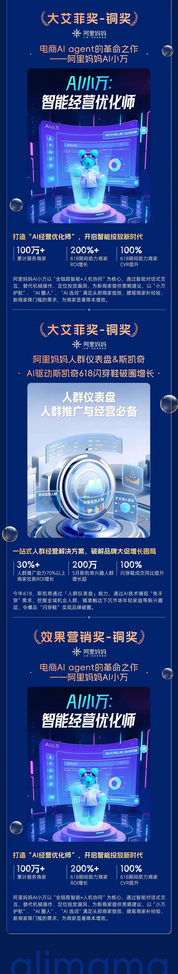 值得关注的是,阿里妈妈自有AI产品同样实力出圈。阿里妈妈AIGC创意荣获「效果营销奖」银奖、「大艾菲奖」铜奖,阿里妈妈达摩盘荣获「效果营销奖」银奖,阿里妈妈AI小万荣获「效果营销奖」铜奖、「大艾菲奖」铜奖,人群推广「人群仪表盘」荣获「大艾菲奖」铜奖,全方位印证了阿里妈妈“让每一份经营都算数”的核心理念,更彰显了其在AI技术研发、产品落地与商业助力上的强劲实力。