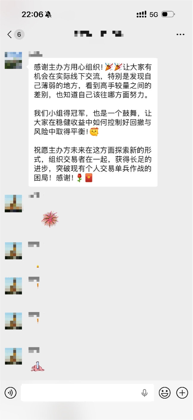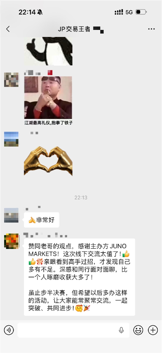 ③赛后,不少选手在赛事交流群中表示,本次活动所搭建的交流平台,为他们提供了与行业大佬交流的机会,在实战与分享中获得了诸多交易启示与思考。同时,选手们也对JUNO MARKETS的冠名支持表示感谢。