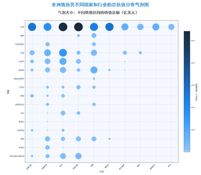 亚洲独角兽论坛分析各国家对应行业的独角兽估值后,发现:1)中国的软件、文娱传媒、交通运输、硬科技、消费、金融科技6个行业总估值均超过1000亿美元;印度仅软件行业总估值超过1000亿美元。2)除中国和印度外,以色列的软件、阿拉伯联合酋长国的文娱传媒估值也相对较高。